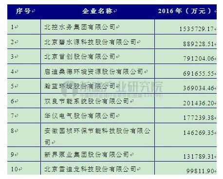 根據(jù)前瞻產(chǎn)業(yè)研究院發(fā)布的《2017-2022年中國(guó)污水處理行業(yè)市場(chǎng)前瞻與投資戰(zhàn)略規(guī)劃分析報(bào)告》顯示:2016年銷(xiāo)售收入排名前10位的企業(yè)其銷(xiāo)售收入都超過(guò)了9億元,其中北控水務(wù)集團(tuán)有限公司更是超過(guò)了150億元。